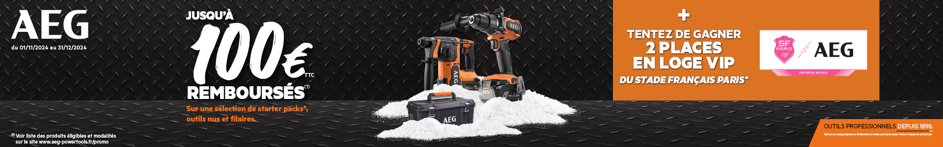 2. REMPLIR intégralement le formulaire de participation (offre 3968) sur le site www.aeg-powertools.fr/PROMO, au plus tard le 15.01.2025 inclus et COCHER LA CASE « Je souhaite participer au tirage au sort pour tenter de gagner deux places de Rugby en loge VIP au stade Français Paris et je confirme être disponible le samedi 15 février ou le samedi 1er mars 2025, dates des matchs »
